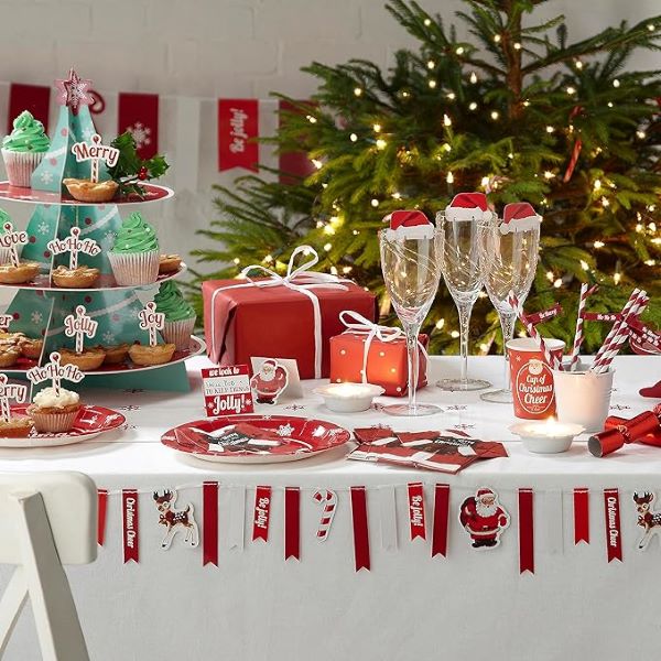Iepakojumā ir 10 kartīšu dekorācijas (5x Ziemassvētku vecīša cepures un 5x brieža), kuru izmērs ir 6 cm plats un 3,7 cm augsts.