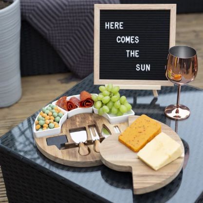Šis dēlis ir īpaši izstrādāts siera pasniegšanai, un tam ir pievienoti nepieciešamie piederumi dažādu veidu sieru griešanai. Uz šī izsmalcinātā koka dēlīša varat pasniegt sagrieztus sierus.