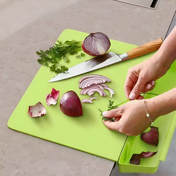 Uzturi virtuves virsmu tīru! Iebūvētais nodalījums savāc atgriezumus un sagrieztos gabaliņus, novēršot ierasto virtuves nekārtību.