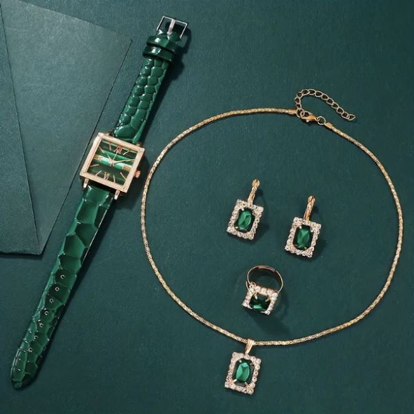 Šajā elegantajā ansamblī ir vintāžas, kvadrātveida rādītāja kvarca pulkstenis, spilgtā, zaļā krāsā, ko papildina žilbinošs rotaslietu komplekts ar kristāliem, ļaujot tev gan uzlabot savu stilu, gan dalīties elegancē ar saviem mīļajiem. 🎁⌚💚