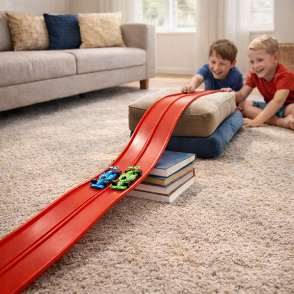 Bērni var veidot trasi, izmantojot ikdienas priekšmetus, lai radītu lēcienus, tuneļus un cilpas, veicinot iztēli un problēmu risināšanas prasmes, nevis atkārtotu spēli. Tas ļauj bērniem koncentrēties stundām ilgi bez ekrāniem.