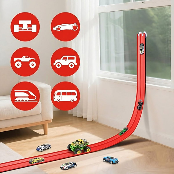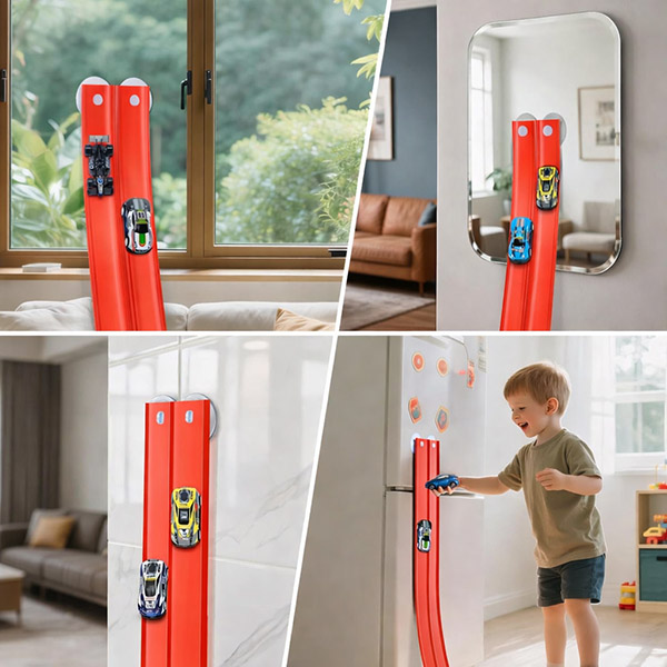 Piestiprināšana ar piesūcekņiem ļauj bērniem un vecākiem ātri pielāgot leņķus un izkārtojumus, tāpēc trasi var atkārtoti pārbūvēt bez instrumentiem vai sarežģītas uzstādīšanas.