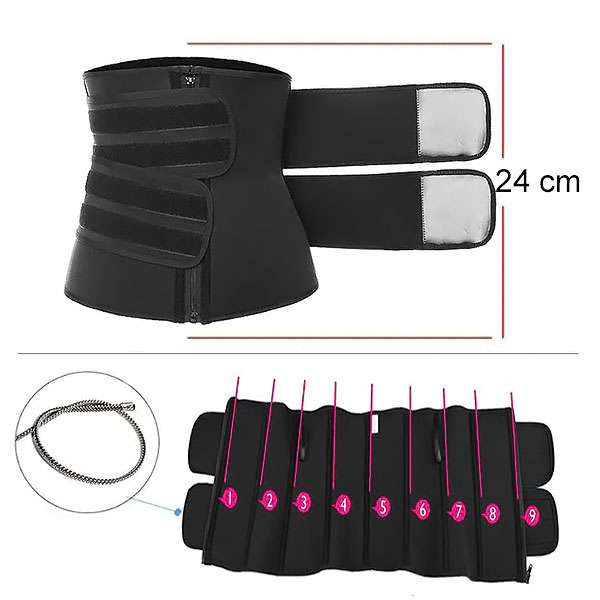 Tas ir aprīkots ar diviem regulējamiem un izturīgiem āķiem, un cilpas aizdari, kas nodrošina ievērojamu atbalstu, vienlaikus uzlabojot kompresiju vēdera un vidukļa apvidū.